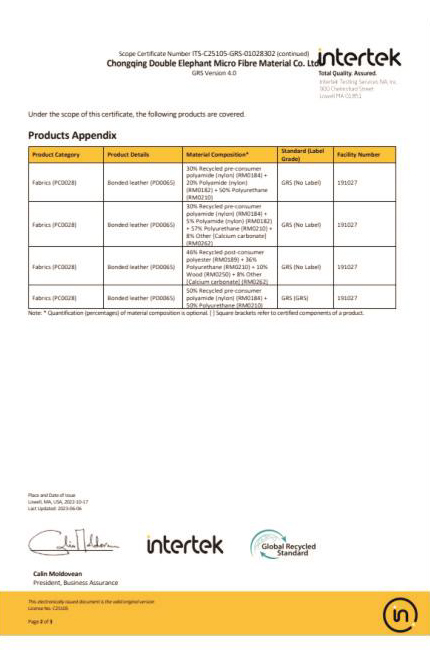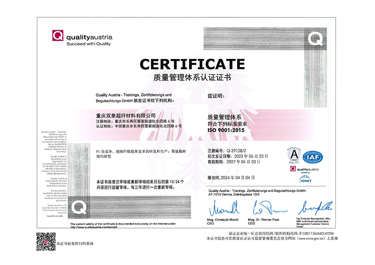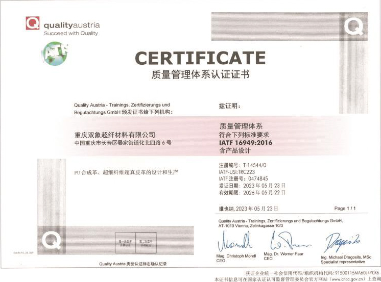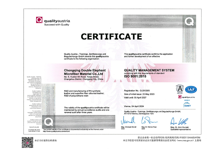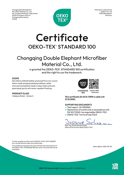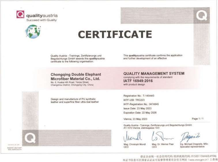 DE adheres to new development concept of innovation,coordination,green development,openness and sharing,takes high-quality development as the goal positioning,and strives to build a modern advanced manufacturing enterprise.DE is China's leading enterprise in artificial leather&synthetic leather manufacturing industry, Jiangsu Province high-tech enterprise,Jiangsu Province 100 key private science and technology enterprises,has undertaken and completed the "national 863 plan project","Jiangsu Province major scientific and technological achievements transformation project"and other national and provincial major scientific research projects,also has undertaken more than 30 national and industry standards drafting and revision work.It was awarded thetitle of"China Microfiber Synthetic Leather lnnovation Research and Development Base"by China Plastics Processing Industry Association. In 2019 DE has built the Double Elephant microfiber Chongging production base in accordance with the requirements of leading technology,intelligent manufacturing,advanced management and environmental friendliness,also this project was listed as amajor investment promotion project by the Chongqing Government,In April,2022,the"annual output of 30million meters of microfiber material phasel project"was put into operation,and was recognized as "Chongqing Digital Workshop"by Chongqing Economic and Information Technology Commission.In 2025microfiber materials phase ll projcet has been finished and start to produce. Double Eelphant Micro Fibre is forging ahead with the goal of being international advanced and leading in China"!Commited to become the leader of Chinese microfiber synthetic leather industry!